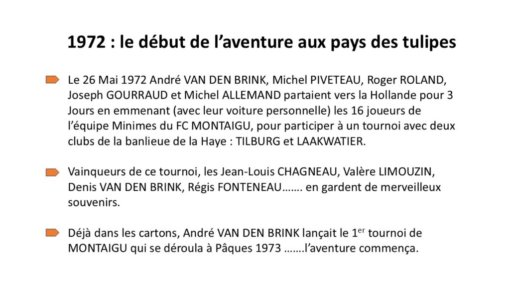 Palmarès du tournoi LES INTERNATIONAUX 2010 …… LES INTERNATIONAUX 2000 – 2009 LES INTERNATIONAUX 1973 – 1999 LES ARBITRES NATIONAUX ET INTERNATIONAUX PALMARES CLASSEMENTS DES EQUIPES PALMARES PARTICIPATIONS le fondateur du tournoi andré van den brink Présentation PowerPoint (mondial-football-montaigu.fr) special 1972 LES GRANDES DATES DU TOURNOI THE BIG DATE OF TOURNAMENT